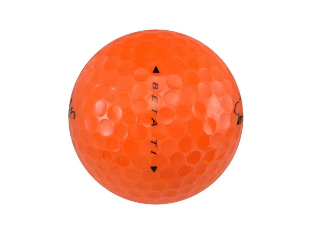 A mix of different brands and styles of Orange golf balls. Brand name of Nitro, Maxfli, Lynx, Intech and more.