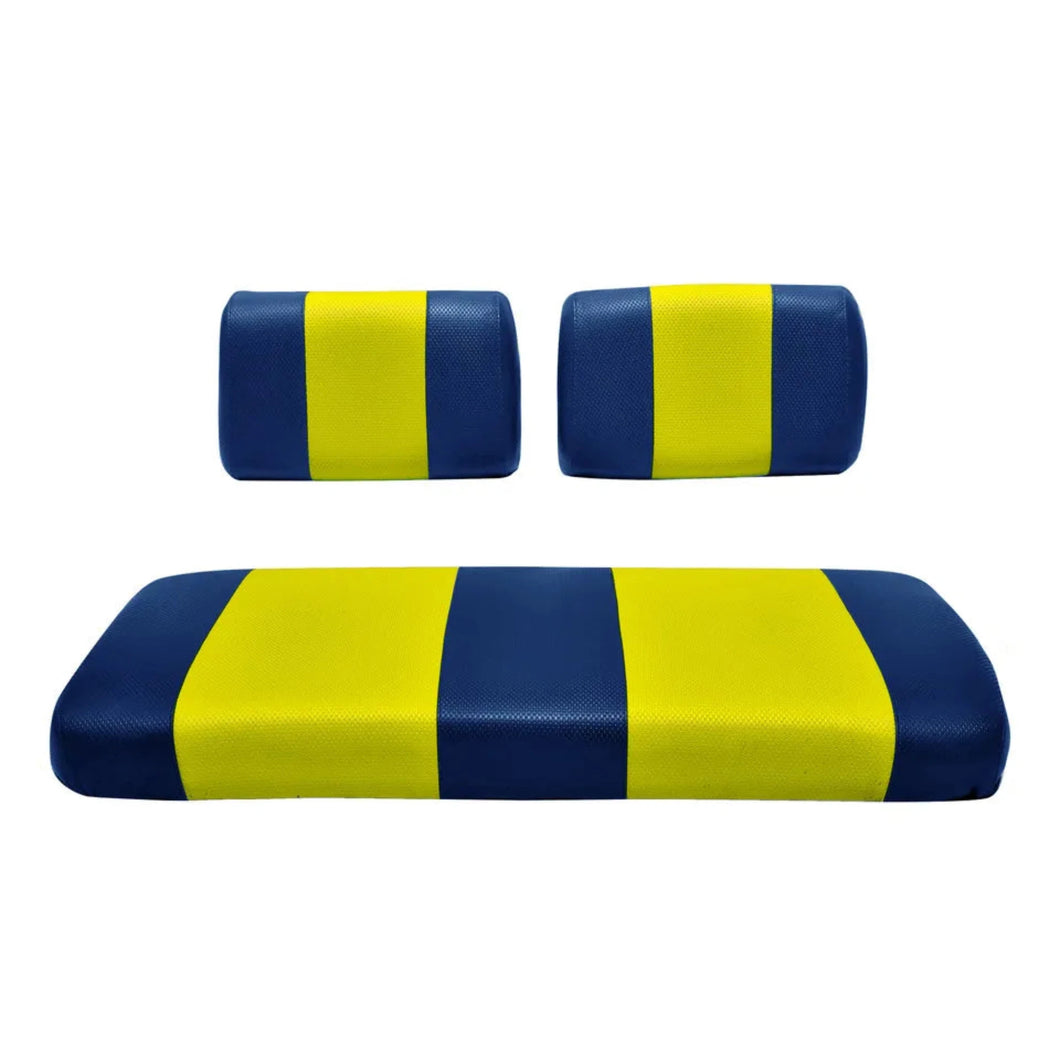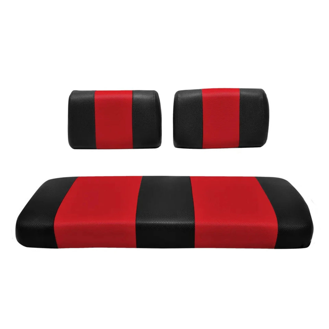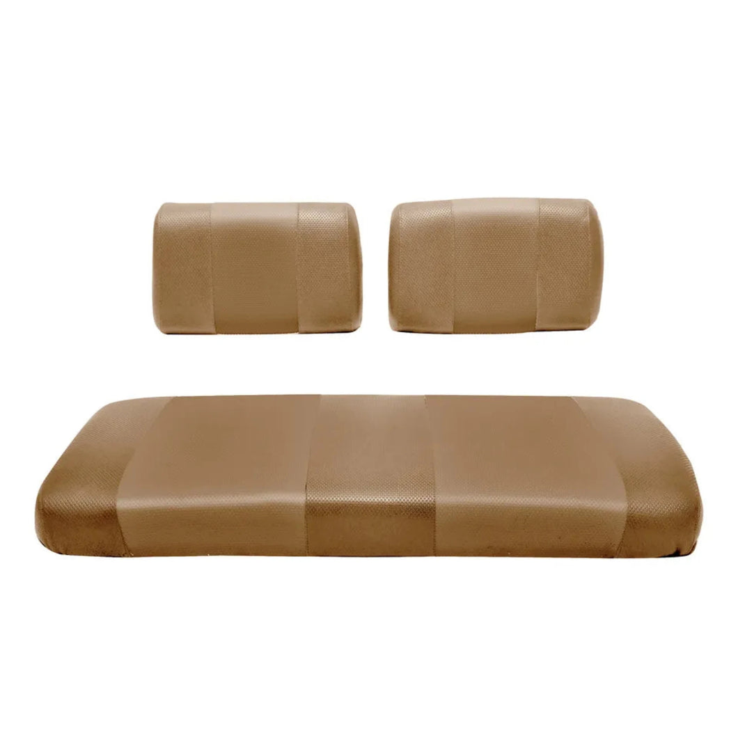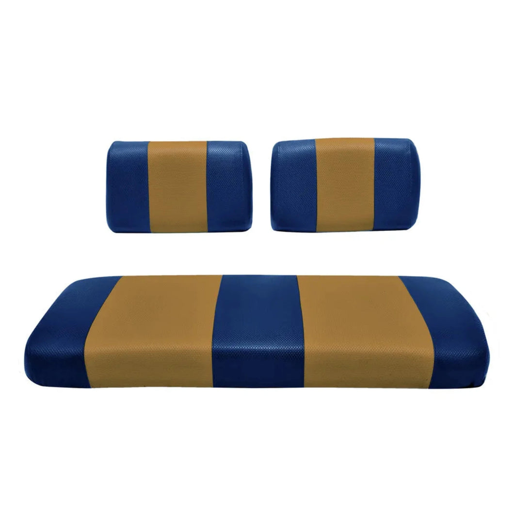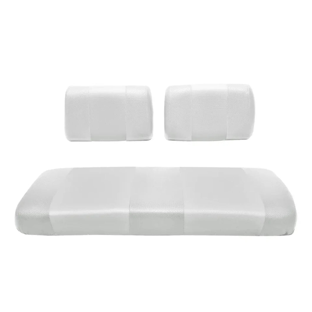 Seat Cover Replacement for Club Car Carry Golf Cart. Three piece set: back rests and bench seat. Are your golf cart seats looking worn and torn? Upgrade your old seat covers and give your golf cart a fresh look! This easy-to-install seat cover replacement for all Club Car Carry golf cart models fits your cart's front or rear bench seats, stapling over the existing cushions. Our seat cover replacements feature marine vinyl with UV inhibitors to protect against fading, moisture damage, and cracking from the cold with high-quality 5-panel stitching to ensure long-lasting durability. User-Friendly Self Installation Unlike other replacement fabrics, our universal fit seat covers are pre-formed, ready to use out of the package, and a breeze to install. To replace, remove your old seat covers. Fit the new marine vinyl cover over your existing seat cushions and staple the cover in place. Enduring Quality Whether you're heading out to the green or storing your golf cart until your next game or season, our durable golf cart seat covers will hold up to the sun and elements year-round. Get only the best golf cart accessories with GOLF BALL DIVERS! Features & Benefits Golf Cart Seat Cover Replacement Ultra-Durable Constructed With Marine Vinyl Weatherproof UV and Water-Resistant 5-Panel Stitching Universal Fits Front and Rear Bench Seats For Club Car Carry, All Model Years Easy Installation Includes One 2pc Replacement Seat Cover With Directions Available in Two-Tone and Solid Color Variations New Cover Staples Over Existing Seat Cushions Premium Golf Cart Accessory